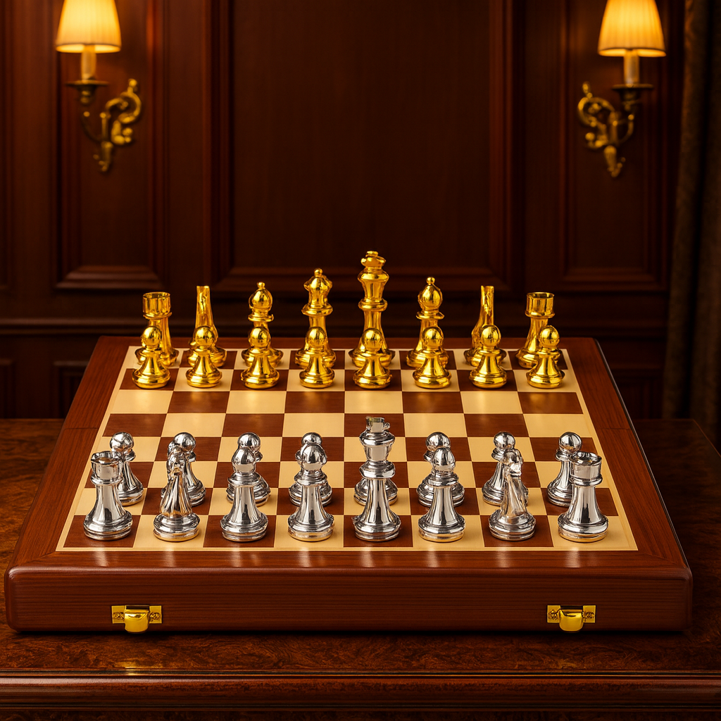 Jeu d’échecs en zinc doré et argenté avec plateau en bois